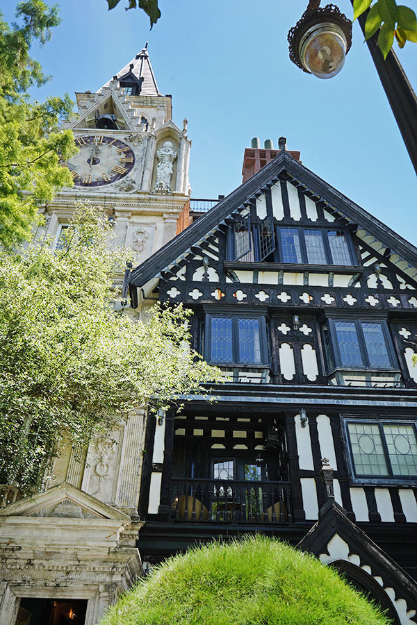 這區庭園很大,也沒什麼遮蔽,英式都鐸建築 Tudor Architecture 的黑白俐落線條、凸肚窗特色,從這個角度一覽無遺,算是我覺得最好拍的地點之一
