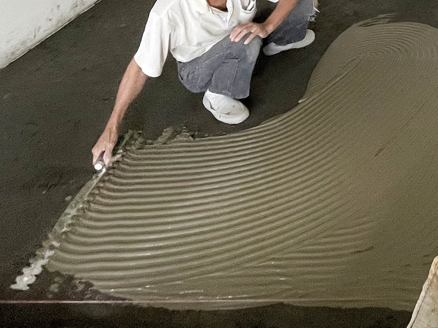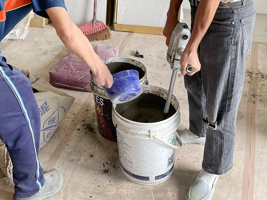 攪拌黏著劑+水泥,攪拌的比例不清楚~總之是工人負責,他們會用專業的器具均勻抹在地坪上。