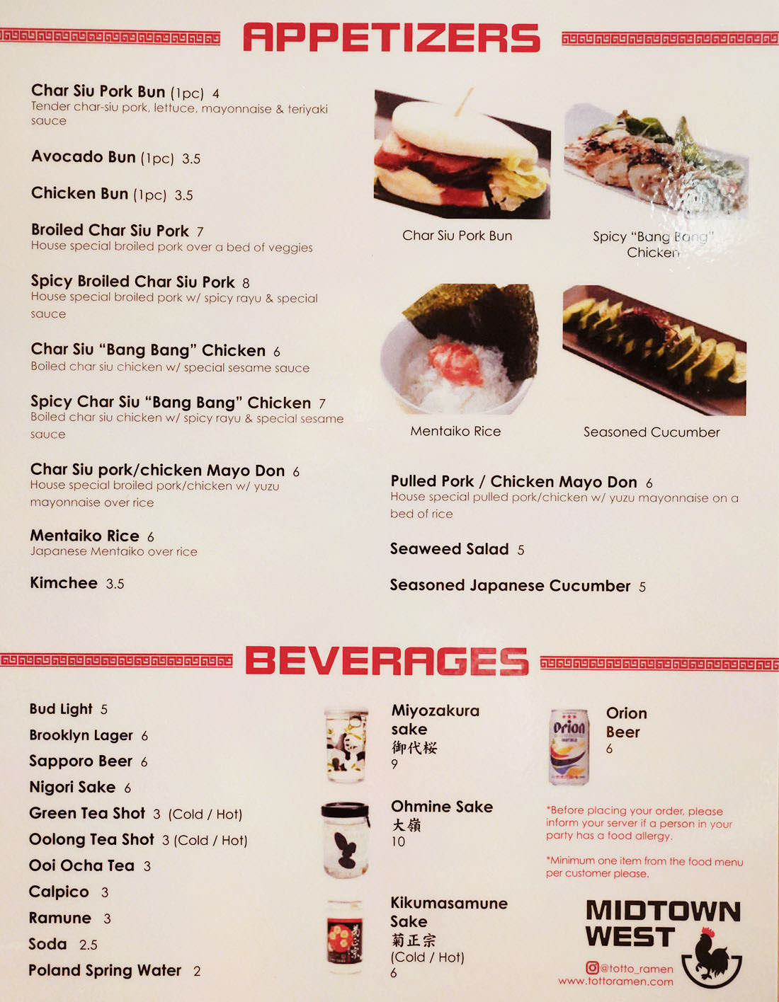 Totto Ramen 鳥人拉麵 目前在紐約有4家分店,位於 Midtown West、Midtown East、Hell Kitchen、Flushing,2010年開業以來就一直是超人氣的紐約拉麵店推薦,台北也在2016年陸續開了2家分店,在台灣我懶得排隊,沒想過第一次吃居然會是在紐約!!